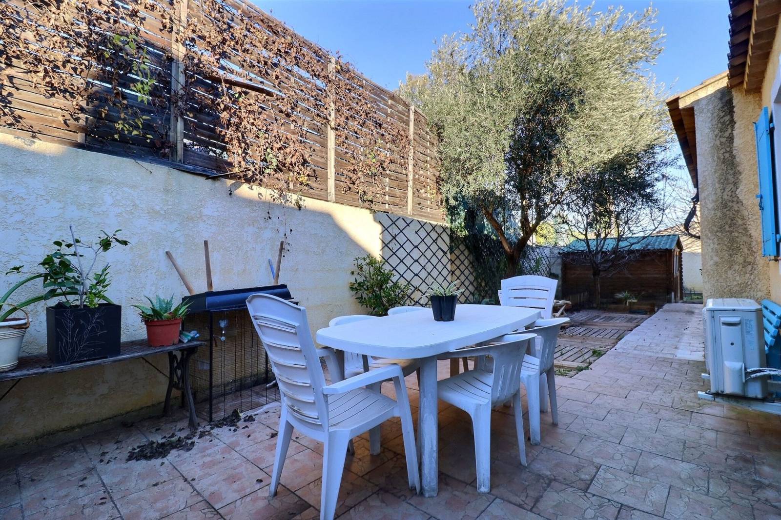 Coté extérieur on retrouve 2 terrasses cotées sud et nord avec un jardin plat et arboré disposant de plusieurs arbres fruitiers