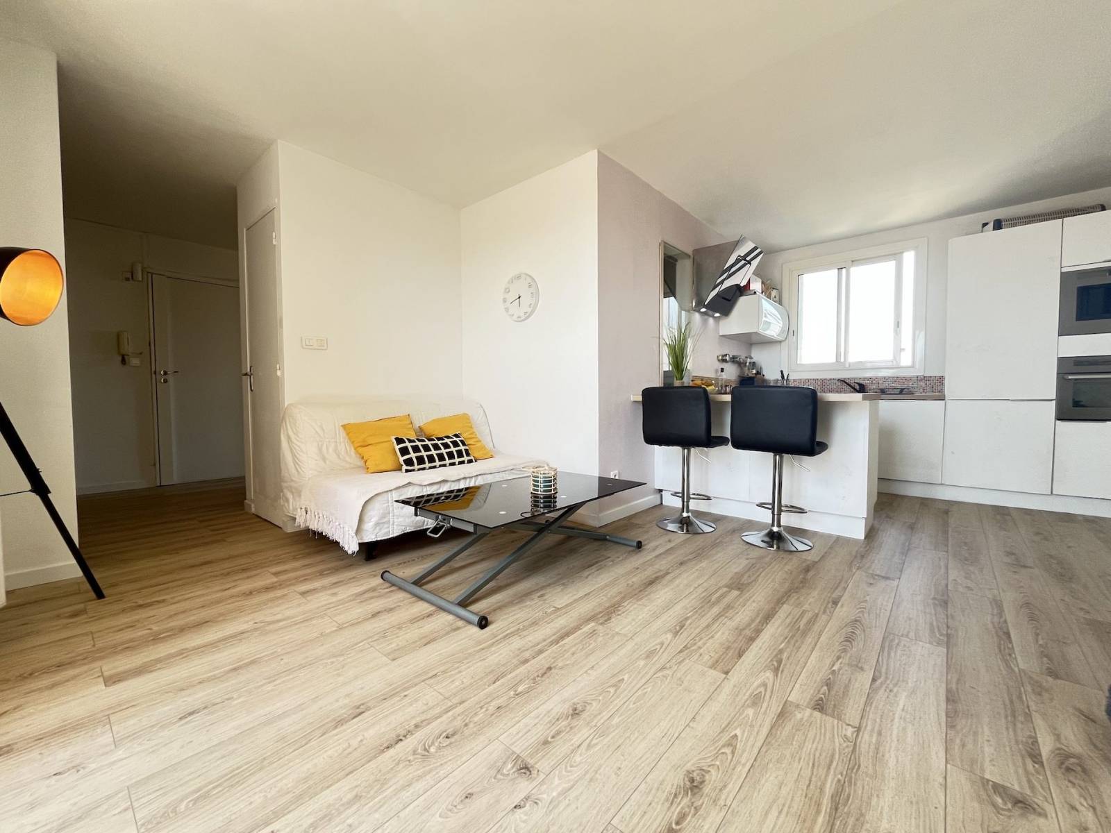 L’entrée s’ouvre sur un vestiaire avec placard intégré de 5 m², offrant un bel espace de rangement dès l’arrivée. La pièce de vie spacieuse de plus de 22 m² bénéficie d’une lumière naturelle traversante, créant une atmosphère chaleureuse et conviviale. La cuisine ouverte, entièrement aménagée et équipée, s’intègre parfaitement dans ce décor épuré et moderne.