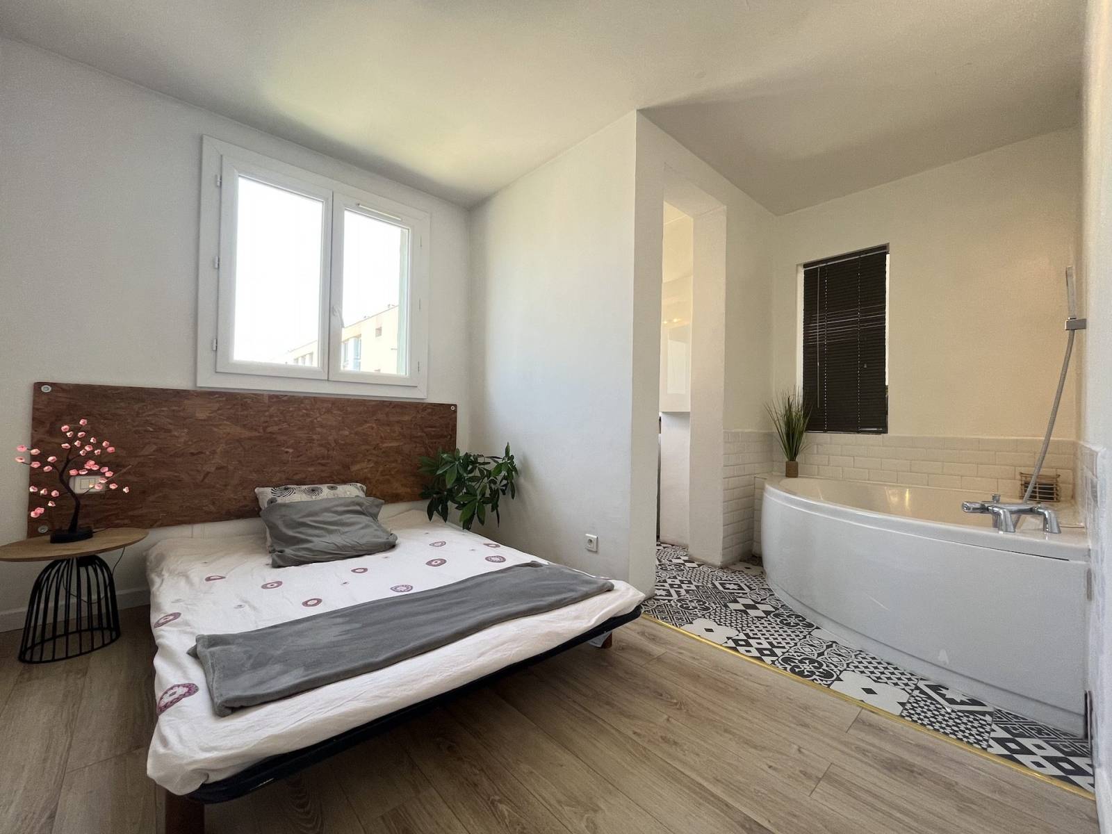 Le coin nuit vous propose une chambre confortable de 12 m², avec sa salle de bain privative, équipée d’une belle baignoire d’angle pour des instants de détente. La climatisation réversible vous assure un confort optimal en toute saison.