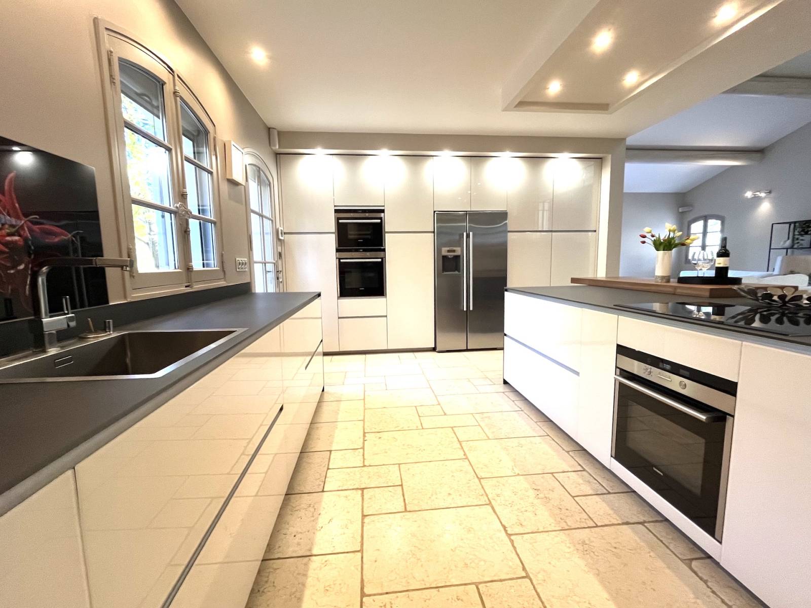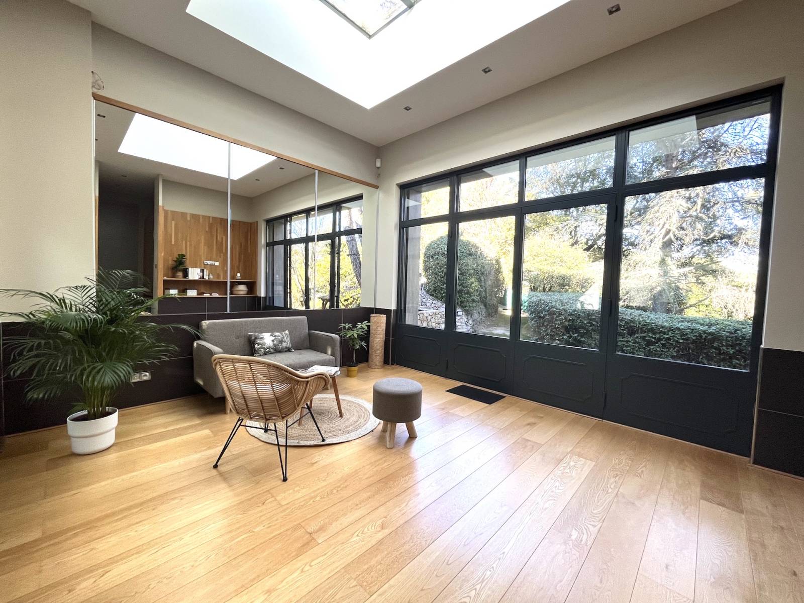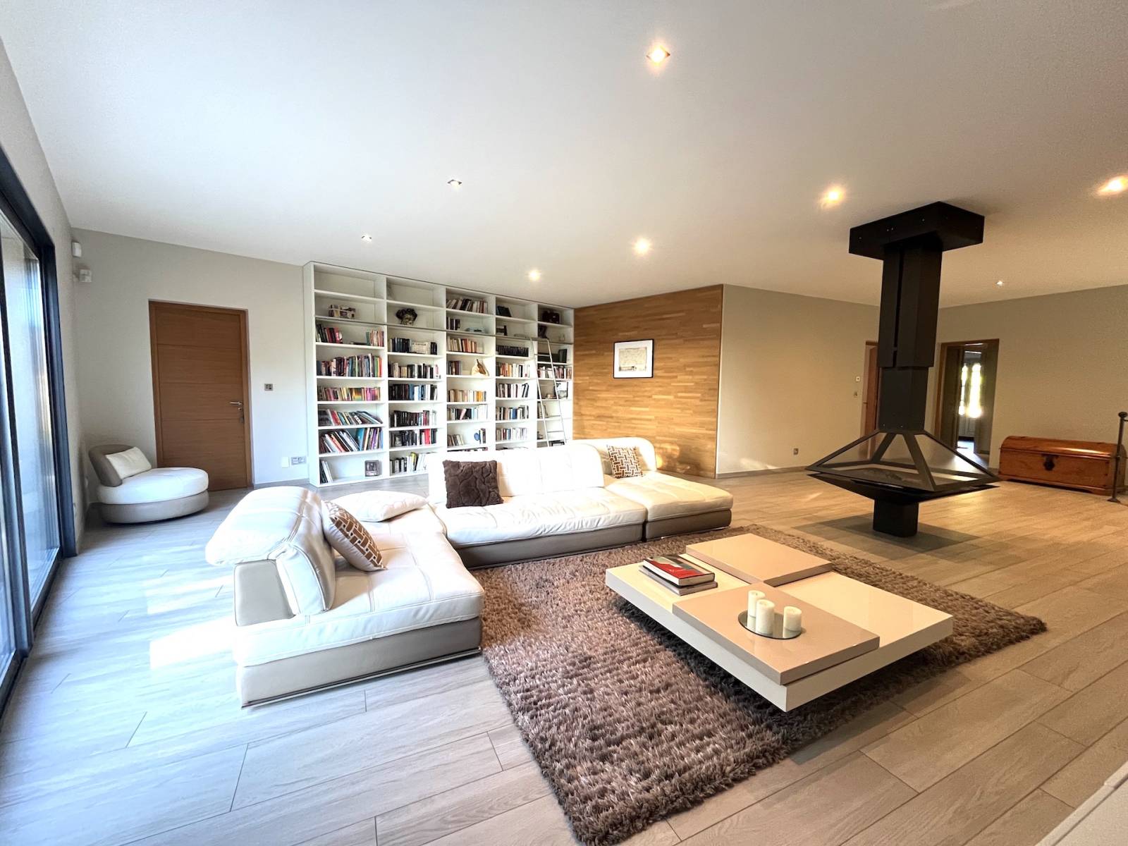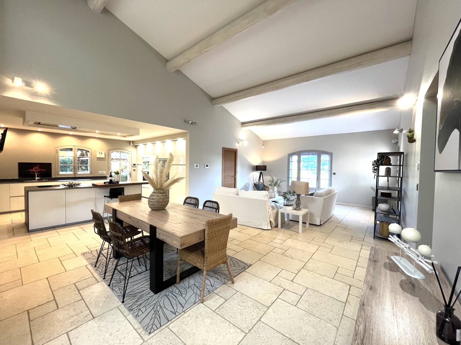 Un vaste espace de vie de 122 m², baigné de lumière grâce à de grandes ouvertures en bois/aluminium double vitrage.