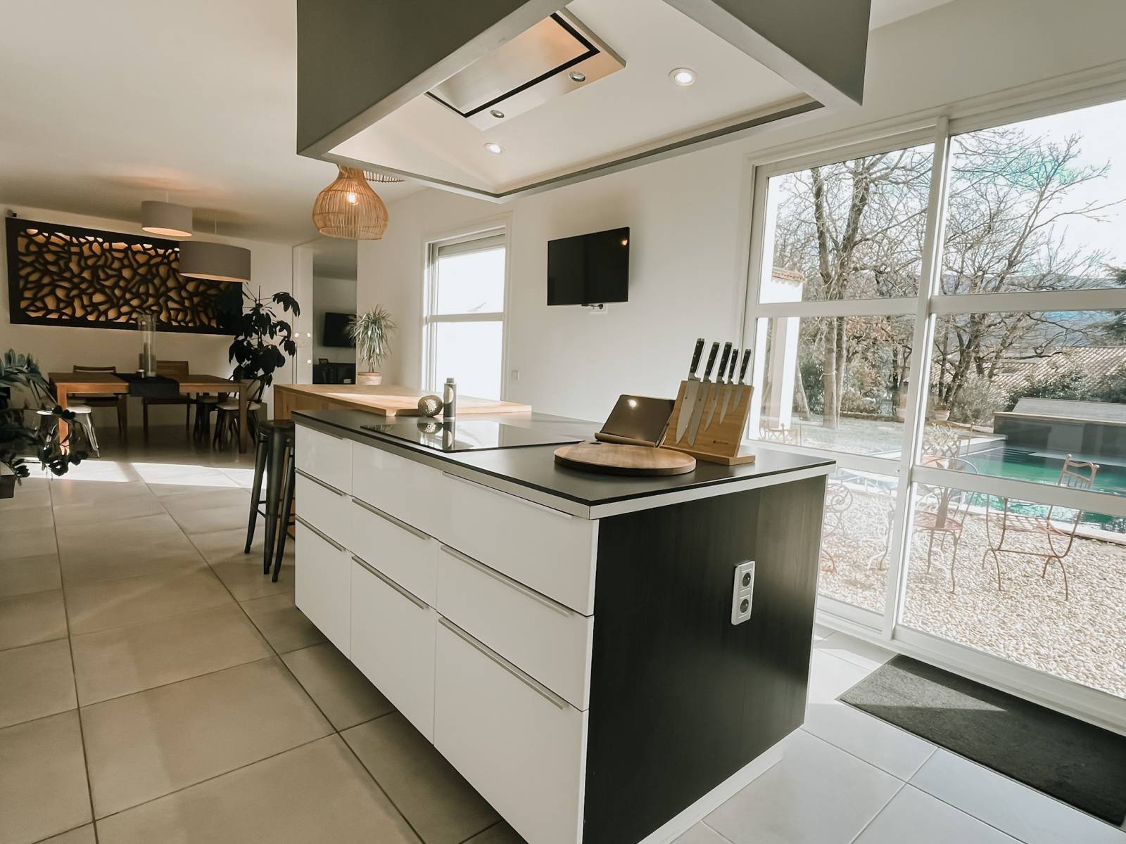 Une cuisine aménagée et équipée, ouverte sur la salle à manger et le salon, pour un espace convivial.